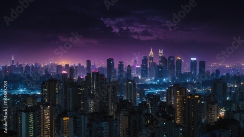 © Purnama Alam, Fototapeta premium Night City Skyline Glowing Buildings Purple Sky