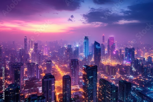 © Agri, Fototapeta premium Night City Skyline Illuminated Under a Vibrant Sunset