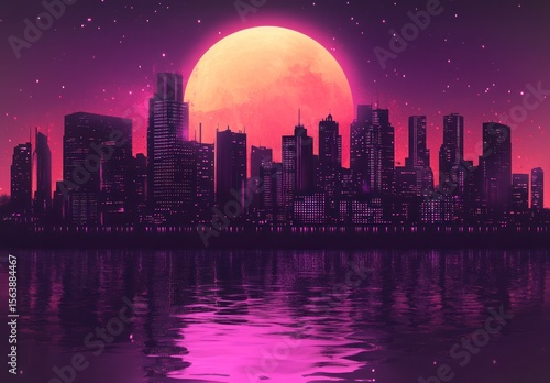 © sarju, Fototapeta premium Night city skyline, large moon, reflected in water, futuristic city, background