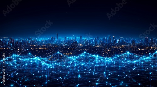 Fototapeta premium Night city skyline, network connections, data flow, urban technology, future