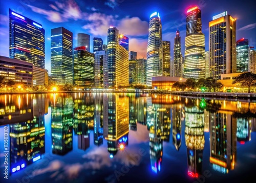 Obraz premium Night City Skyline Photography: Glass Skyscrapers, Bright Lights, Urban...