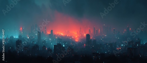 © Bruce, Fototapeta premium Night city skyline silhouette with glowing neon lights and modern skyscrapers under dark sky, urban view with large space for text overlay, perfect for marketing and event promotion.