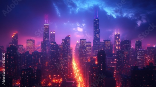Obraz premium Night city skyline, vibrant purple, glowing lights.
