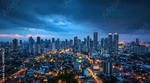© Selvi, Obraz premium Night City Skyline with Dramatic Clouds and City Lights
