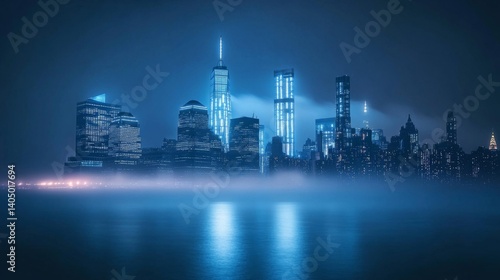 © Lintan, Obraz premium Night City Skyline With Fog And Blue Lights