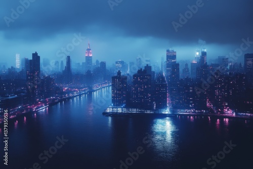 Fototapeta premium Night city skyline with illuminated skyscrapers reflecting in the river