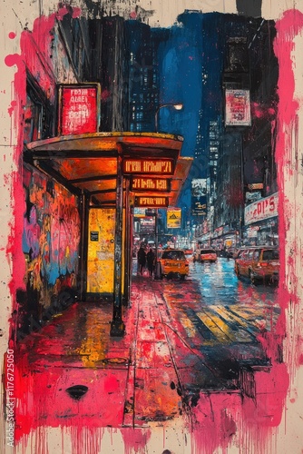 © Ali, Fototapeta premium Night city street scene, vibrant abstract painting.