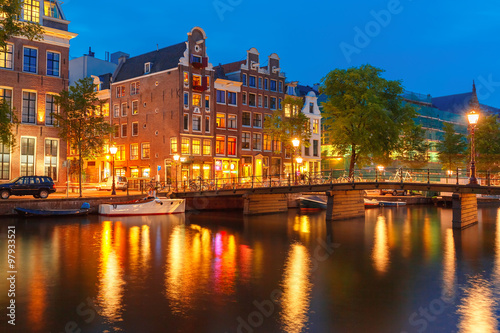 © Kavalenkava, Obraz premium Night city view of Amsterdam canal and bridge