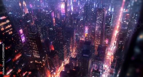 © BerkahStock, Obraz premium Night cityscape, aerial view of illuminated skyscrapers and streets.