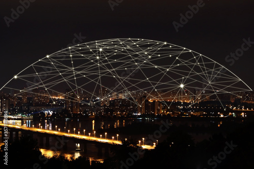 Obraz premium Night cityscape and network connection lines. Cloud technology