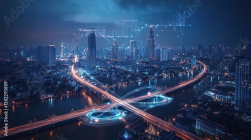 Fototapeta premium Night cityscape, city highway, river, data network. Possible stock photo use technology, business, future