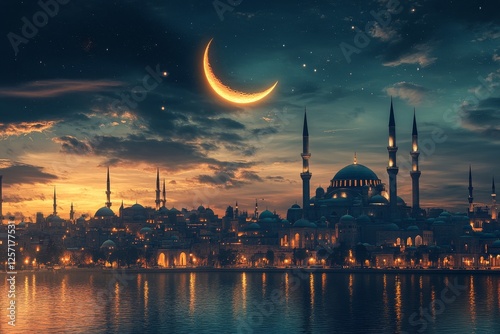 © Denny, Fototapeta premium Night cityscape, crescent moon, mosque, water, stars, Ramadan