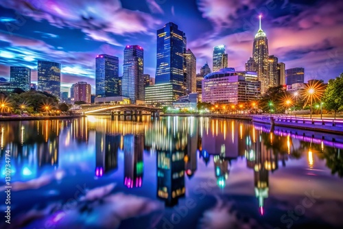© Four888, Fototapeta premium Night Cityscape Dipper Shot - Stunning Urban Lights at Dusk