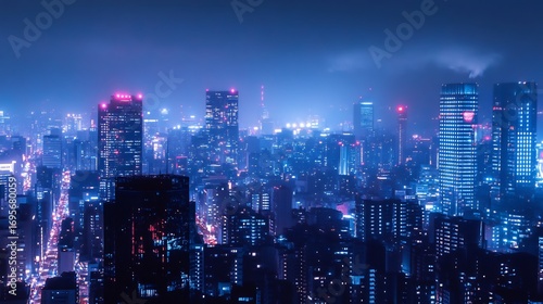Fototapeta premium Night Cityscape: Electric Blue and Pink City Towers at Dusk