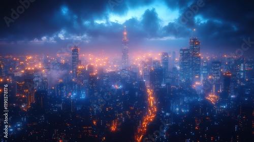 Fototapeta premium Night cityscape, futuristic city skyline with illuminated buildings and dramatic clouds.