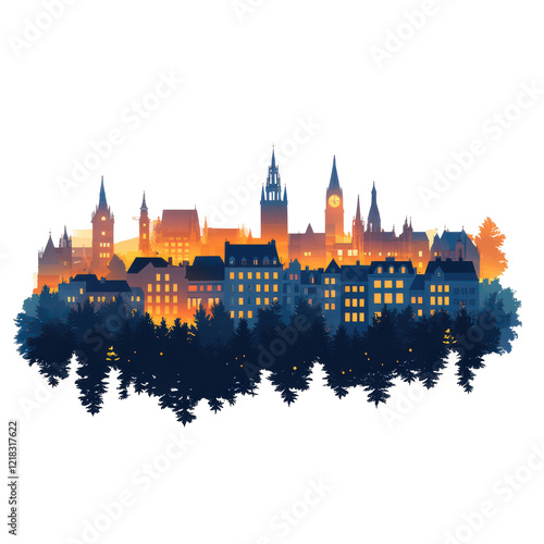 Obraz premium Night cityscape glowing city buildings trees silhouette