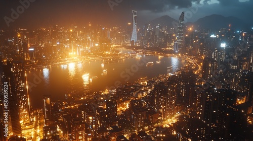 © Shahnaz, Obraz premium Night Cityscape Golden Hour Urban Skyline Lights Buildings sea art view dark water river coast image