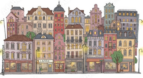 © Tida, Fototapeta premium Night Cityscape: Illuminated Buildings and Streetlights - Charming cartoon illustration of a night city street scene, featuring illuminated buildings, streetlights