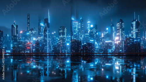 Fototapeta premium Night cityscape illuminated by blue lights, skyscrapers and clouds in the sky