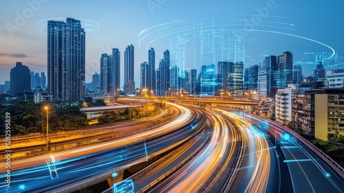 © Memayu_Std, Fototapeta premium Night Cityscape Illuminated Highway Traffic Flowing Through Modern Buildings
