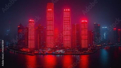 © Jajang, Fototapeta premium Night cityscape, illuminated skyscrapers, red lights, city waterfront