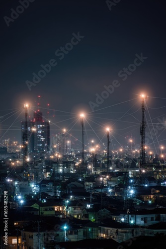 © erwin, Fototapeta premium Night cityscape, industrial area, blurred structures, connecting lines. City lights, faint, glowing, network
