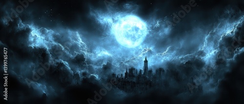 © Abdul, Fototapeta premium Night Cityscape, Moonlit Cloudscape, Fantasy Game Background