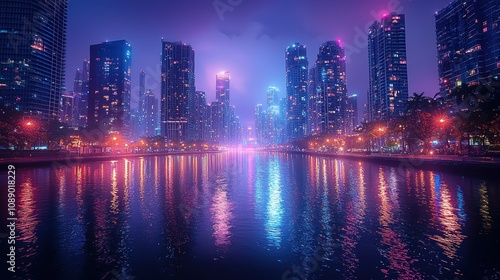 Fototapeta premium Night Cityscape Neon Lights Reflecting on Water Modern Architecture Urban Scenery