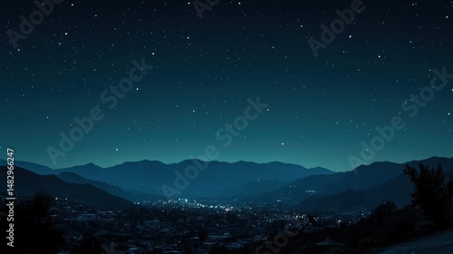 © TarkimanTarkiman, Fototapeta premium Night cityscape nestled among dark, silhouetted mountains.