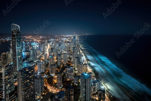 © halawiah, Obraz premium Night cityscape of city, coast at night with coastline lights glowing below
