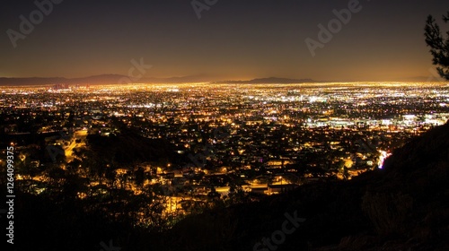 © NAIMAH, Fototapeta premium Night cityscape panorama from hilltop, distant mountains, city lights, travel brochure