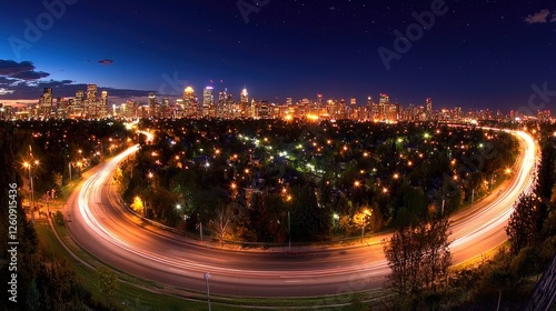 Fototapeta premium Night cityscape panorama highway curves around illuminated suburbs towards...