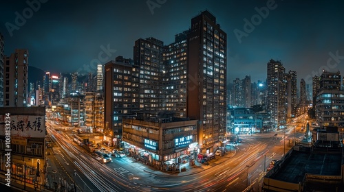 © Arifin Studio, Fototapeta premium Night cityscape panorama showing illuminated buildings, streets, and traffic.