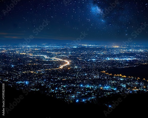 Fototapeta premium Night cityscape panorama under a starlit sky, showcasing a sprawling...