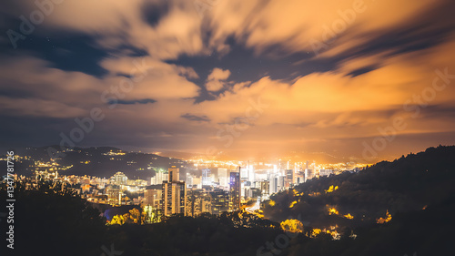 Obraz premium Night cityscape panorama with illuminated city nestled in a valley dramatic cloudscape