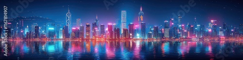 © M_H_L, Fototapeta premium Night cityscape panorama with vibrant neon lights reflected in water.
