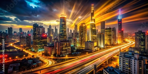 Fototapeta premium Night Cityscape Portrait: Red & Yellow Light Streaks, Dramatic Skyline