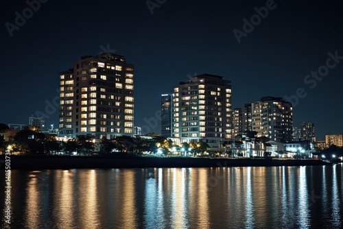 © a muh sakaria, Naklejka premium Night cityscape reflected in calm water (1)
