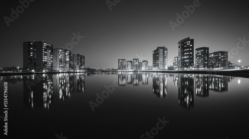 Fototapeta premium Night cityscape reflected on water, urban skyline