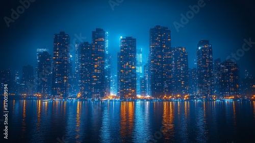 © siyons, Fototapeta premium Night Cityscape Reflecting In Dark Water
