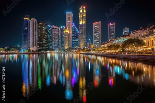 © U art, Naklejka premium Night cityscape reflecting on water. Skyscrapers and older buildings illuminated by colorful lights