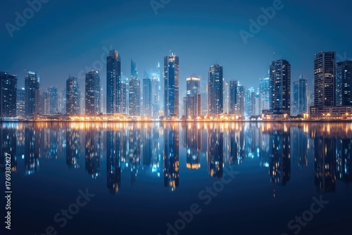 © Hidayat, Fototapeta premium Night cityscape showcasing illuminated skyscrapers mirrored in tranquil water