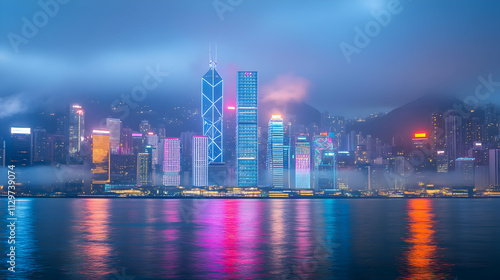 © StudioX, Fototapeta premium Night cityscape skyline reflected in water, fog.