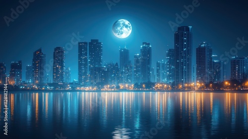 Fototapeta premium Night cityscape skyline reflected in water with a large full moon.