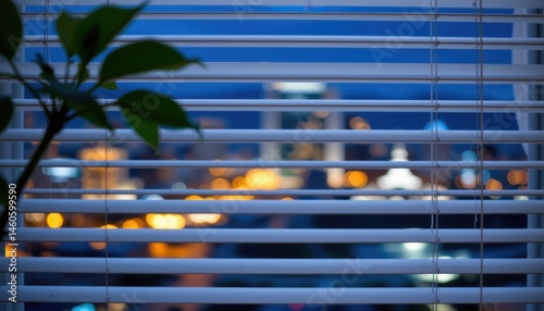 Obraz premium Night cityscape through blinds urban setting photography evening atmosphere framed view visual serenity