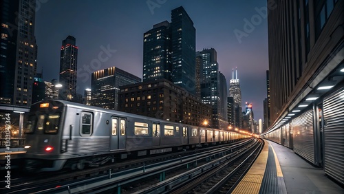 Naklejka premium Night Cityscape Urban Train Station with Modern Architecture and Dramatic...