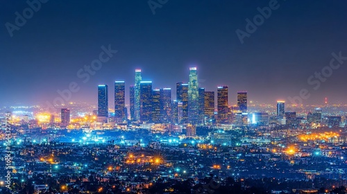 © Yuyun, Fototapeta premium Night cityscape view of a major US metropolis. Brightly lit skyscrapers and city lights stretch across the horizon