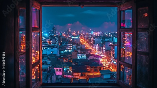 Obraz premium Night Cityscape Viewed From an Open Window
