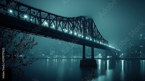 © bulegendut, Fototapeta premium Night cityscape with bridge, fog, and city lights reflected in water.