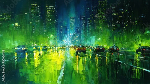 Naklejka premium Night Cityscape with Cars Neon Lights and Rain